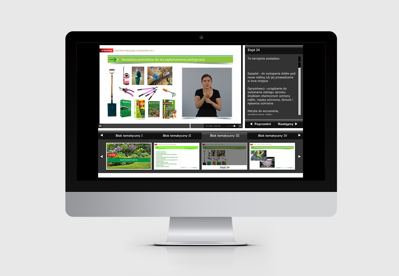 Kurs przedstawi podstawową wiedzę w zakresie: pielęgnacji przydomowych ogródków, zieleni zewnętrznej przy małych firmach oraz ogrodów i zieleni osiedlowej. Program ma na celu przygotowanie osoby niesłyszącej do stopniowego rozszerzenia świadczonej usługi o pielęgnację nagrobków, terenów przy nagrobkach czy pielęgnację roślin doniczkowych wewnątrz firmy jak: na tarasach i w holach czy recepcjach. Z czasem nabyte doświadczenie w zakresie pielęgnacji roślin i ogrodów pozwoli rozszerzyć usługę o projektowanie i zakładanie nowych ogrodów lub gruntowna modernizacje czy przebudowę starych ogrodów.